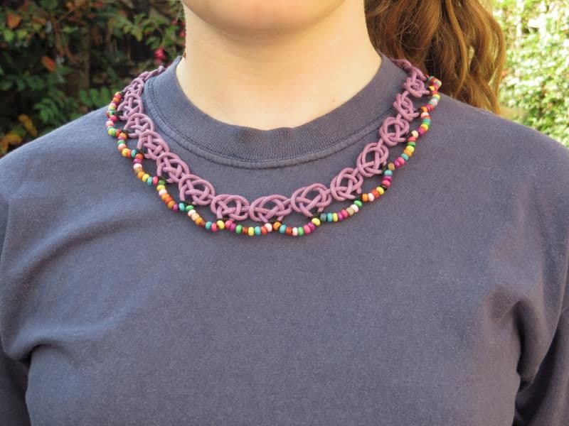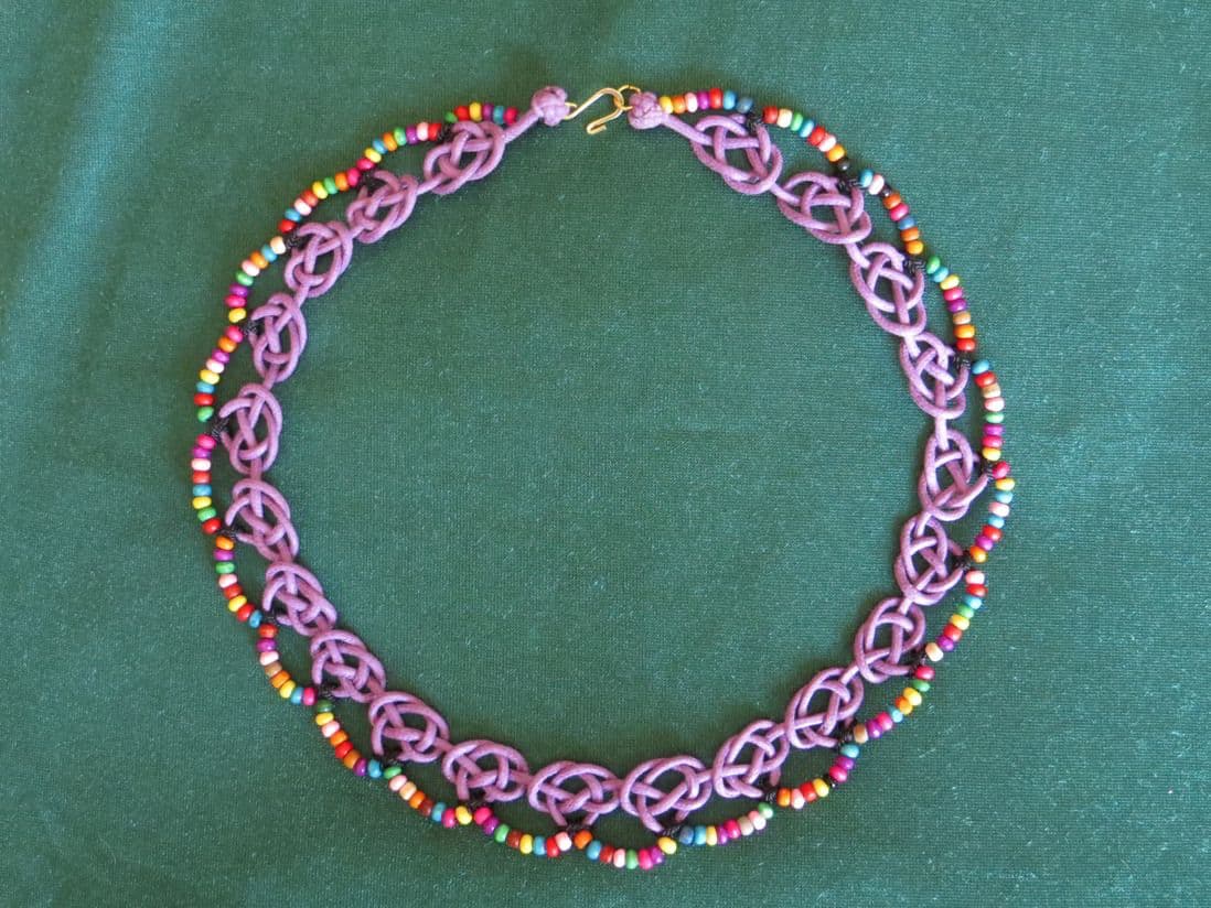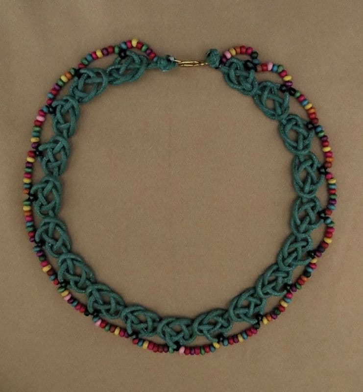 This delightful necklace made using the Josephine knot incorporates scollops of multi coloured beads which compliment the shape of the knot.