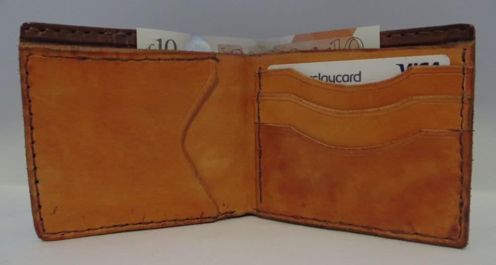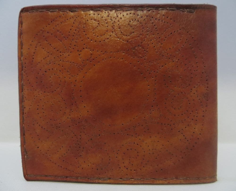 This mottled mid tan wallet has a spiral pattern created using a technique called prick-dot.